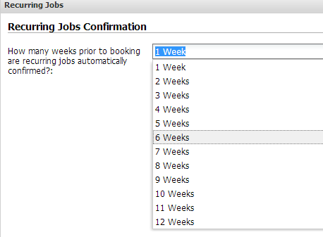 Recurring jobs activate (i.e. automatically create and schedule themselves) a default of 1 week before their recurrence date. You can change this setting to a maximum of 12 weeks before their recurrence date, in Settings > Preferences > Recurring Jobs: