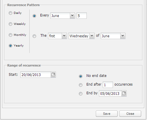 If you set a job to recur on the first Monday of November every year, with a start date of 1 November of the same year, the start date (1 November 2022 in this example) is before the recurrence date (first Monday of November) in this calendar year, so the first job will be created this year for the first Monday of November 2022.